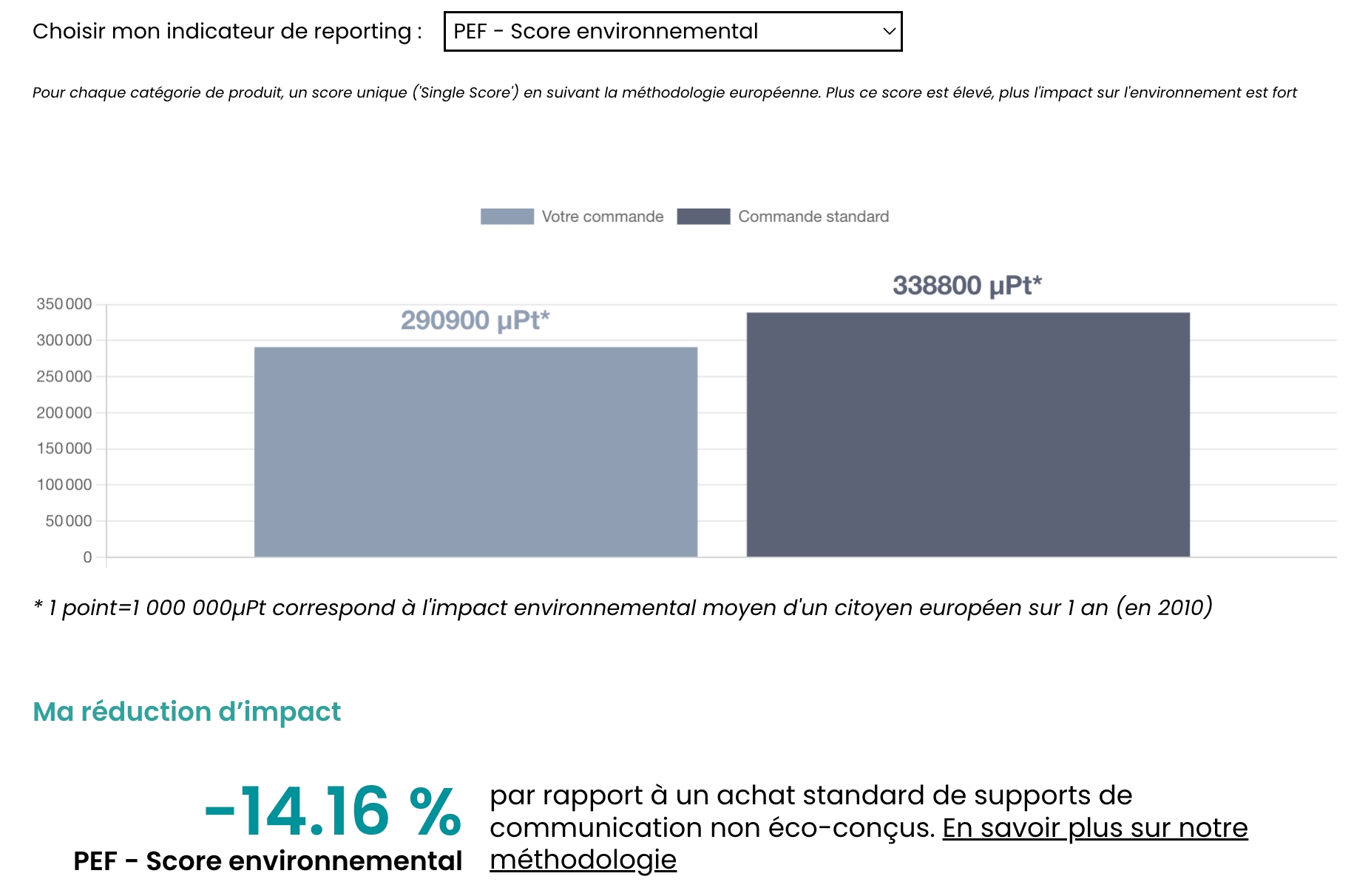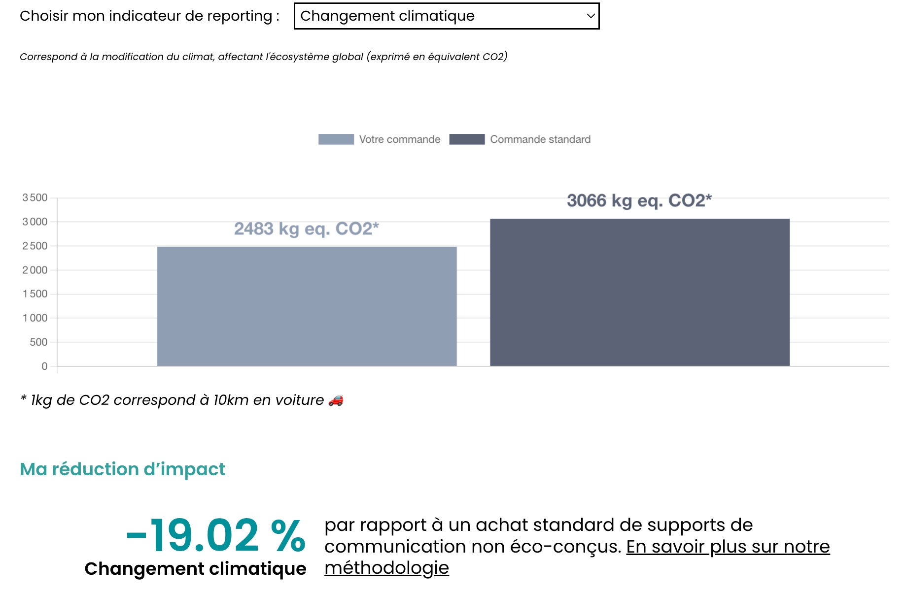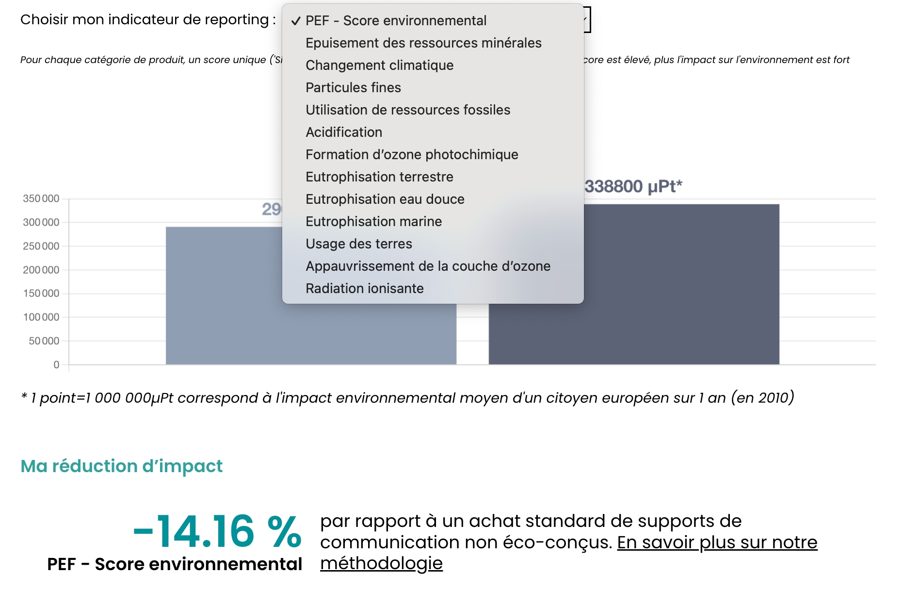 Vous pouvez changer l'indicateur de reporting pour avoir la valeur absolue de chaque indicateur et le pourcentage de réduction d'impact. Cela vous permet notamment de faire un reporting plus fin sur un indicateur important pour votre entreprise :